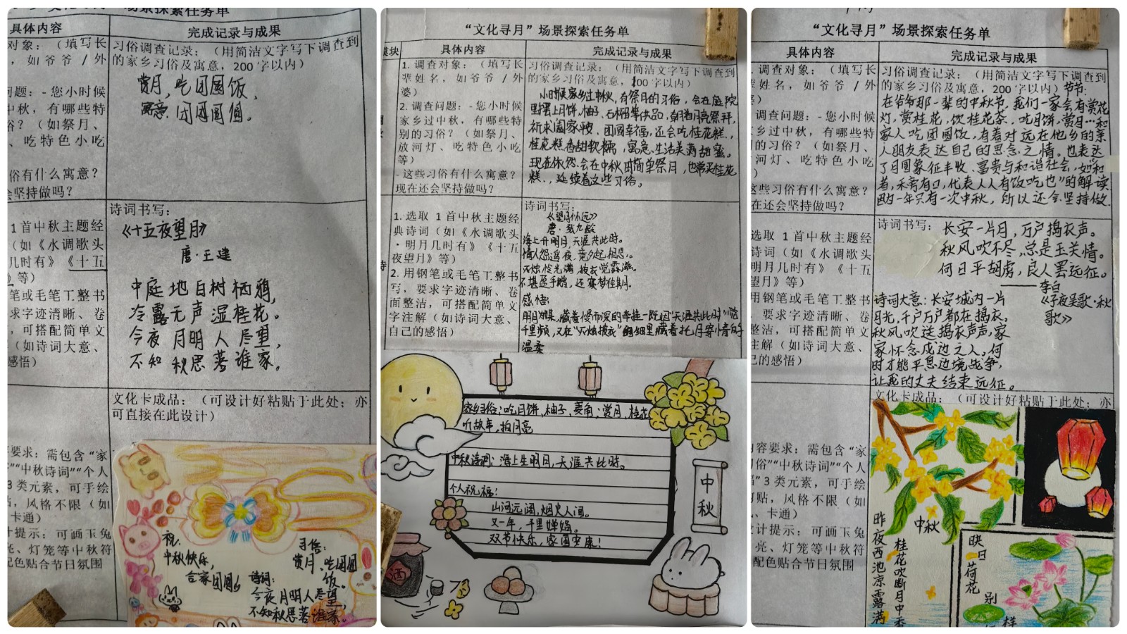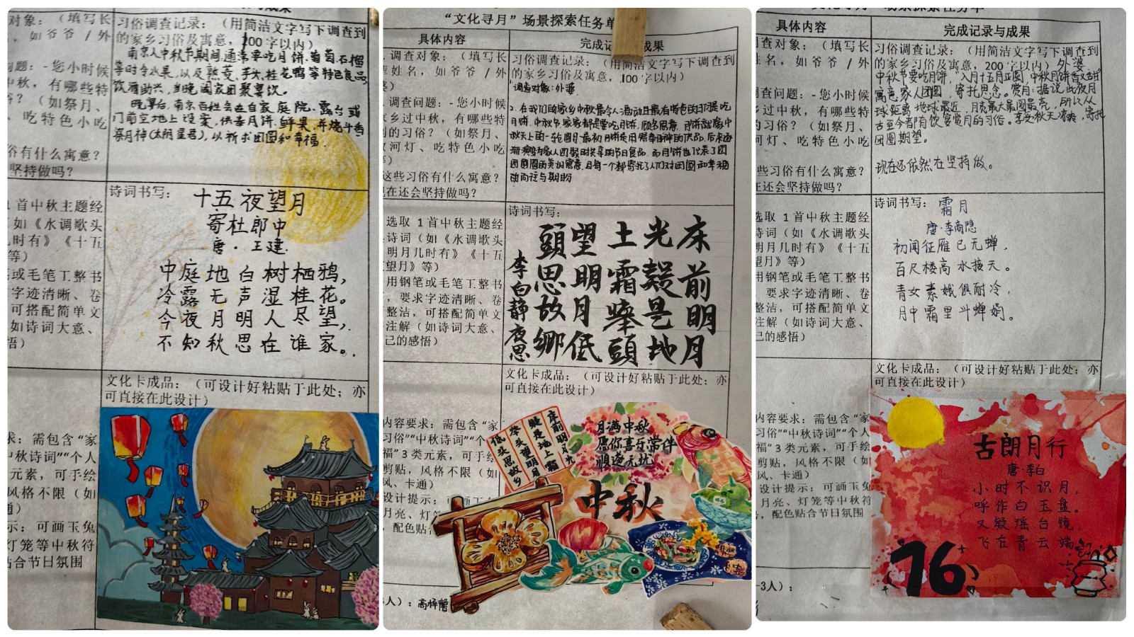 活动中,各小组分工协作:通过访谈长辈整理“家乡中秋档案”,记录祭月流程、特色饮食等习俗,搜集唐至清各朝代中秋诗词,分类解读后完成硬笔或软笔书写,并设计“中秋文化卡片”,巧用色彩与装饰传递中秋氛围。