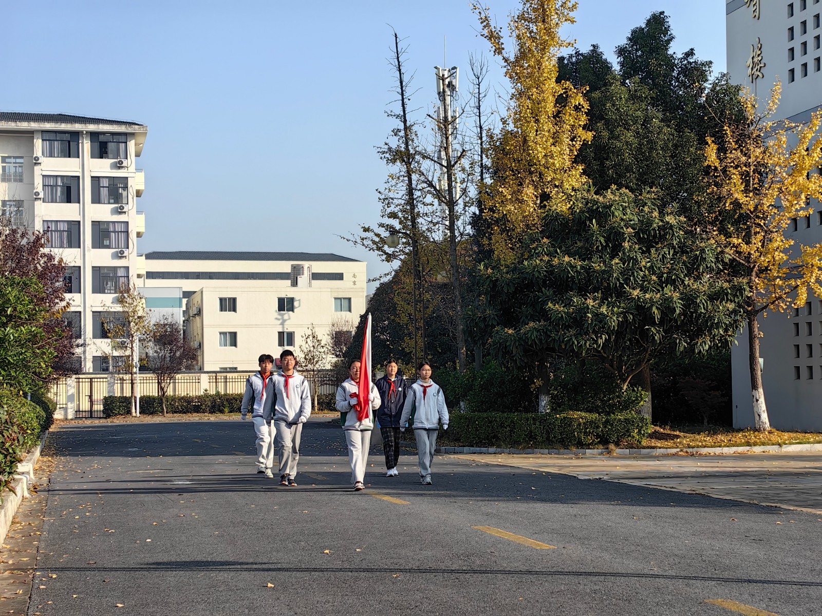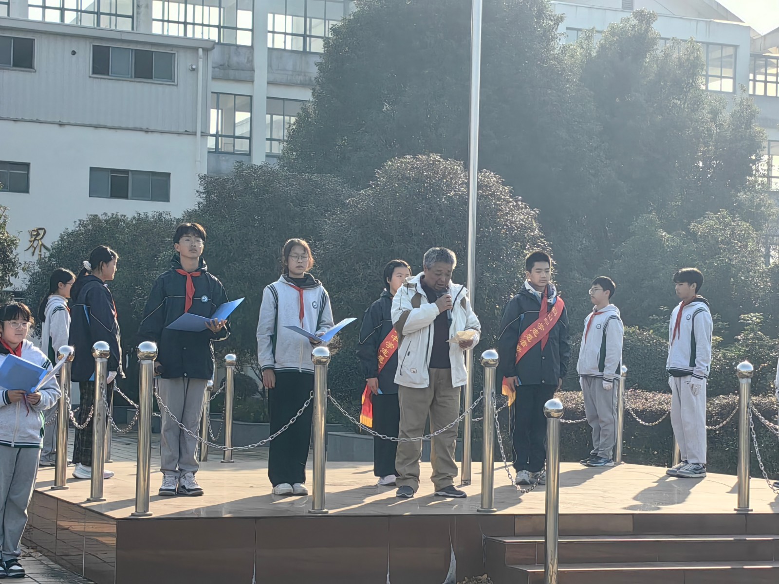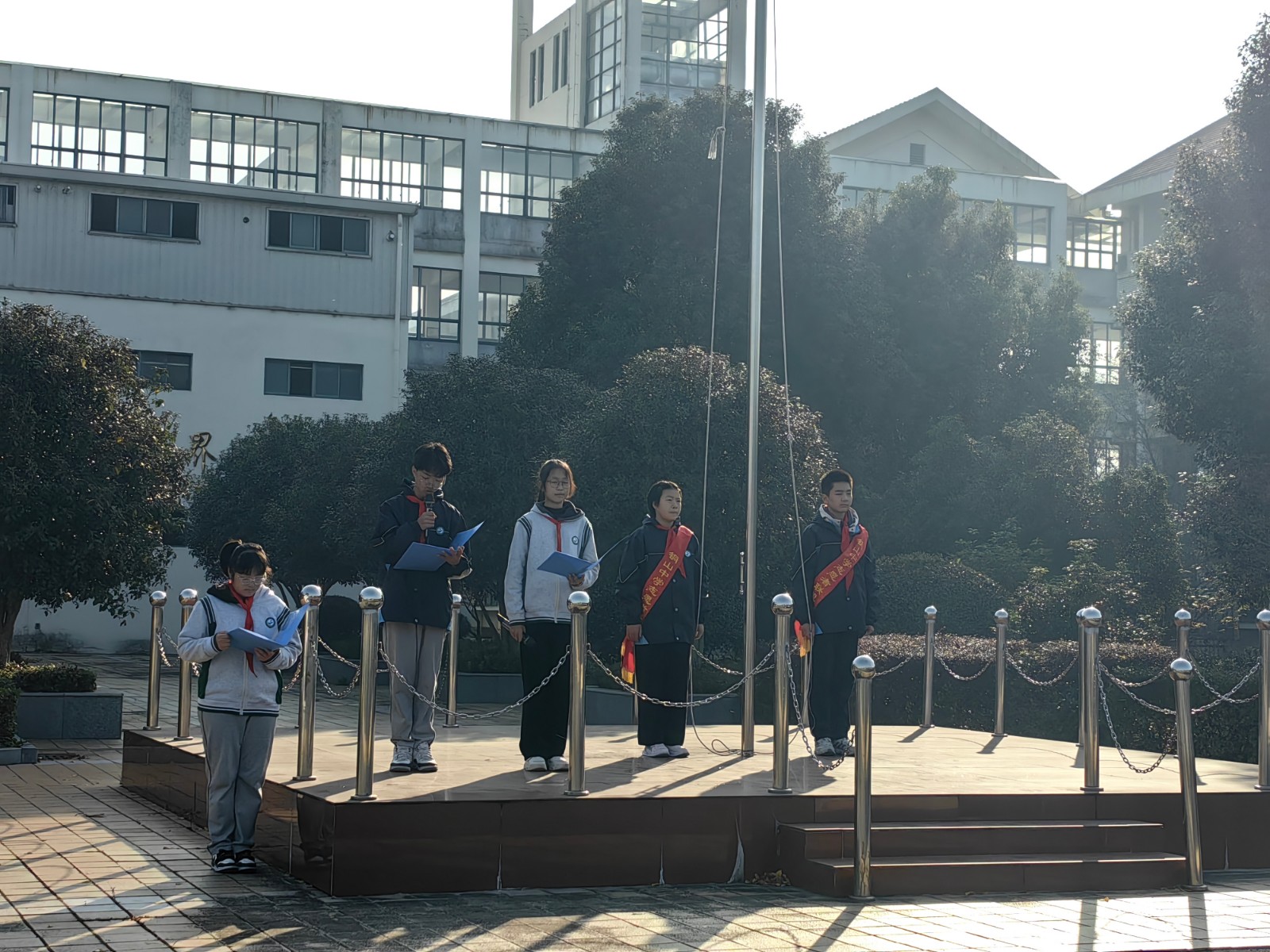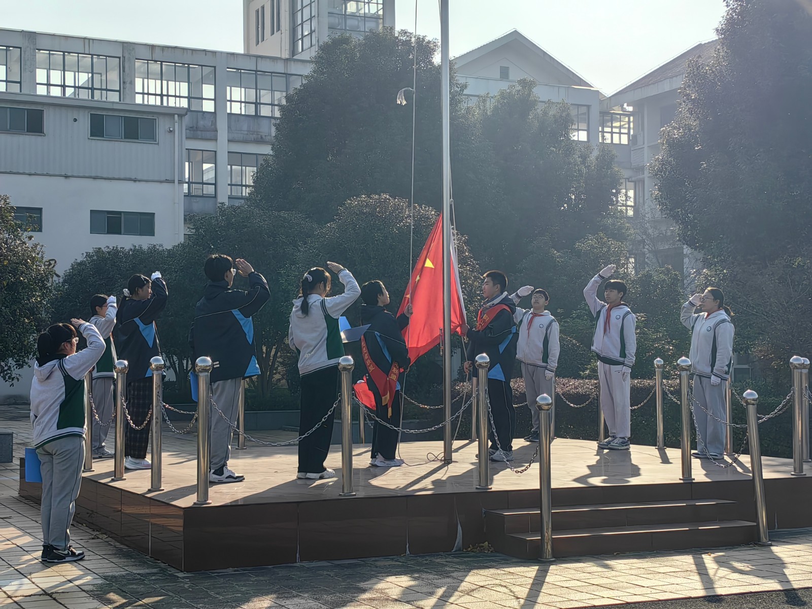 升旗手余梦泽,余梦泽同学担任七3班班长,他性格开朗,爱好打乒乓球,他的座右铭是“博学而笃志,切问而近思,仁在其中矣”